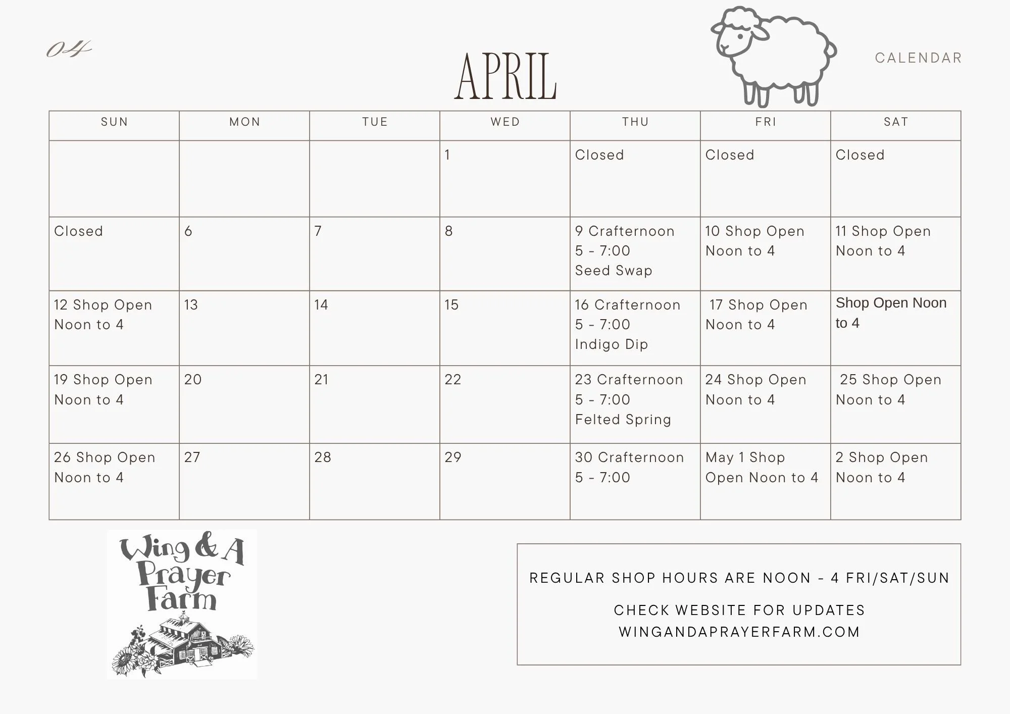 Our Farm Shop is in a beautiful new space. It is open Fri-Sun noon to 4. On April 2-5 we will be closed for family holiday time.